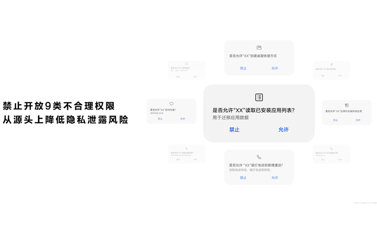 首先,鴻蒙 NEXT 全面梳理(lǐ)了所有(yǒu)系統授權,取消了 9 類不合理(lǐ)權限,有(yǒu)效避免了潛在的隐私洩露風險。這些權限包括讀取已安(ān)裝(zhuāng)應用(yòng)列表、訪問短信、訪問存儲文(wén)件、創建桌面快捷方式、獲取設備信息、顯示懸浮窗、訪問通話記錄、應用(yòng)内安(ān)裝(zhuāng)應用(yòng)以及撥打電(diàn)話和管理(lǐ)通話。其次,鴻蒙 NEXT 改變了傳統的權限控制邏輯,從“管權限”轉變為(wèi)“管數據”,從而為(wèi)用(yòng)戶提供更高級别的隐私保護。