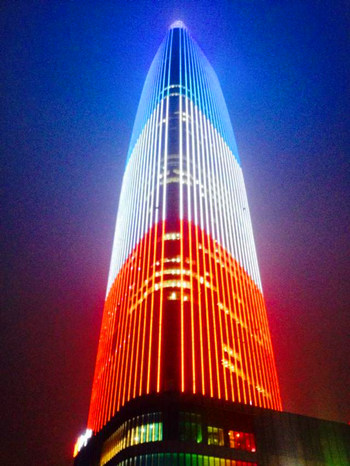 為(wèi)巴黎祈福,濟南綠地最高樓亮起“法蘭西之色”